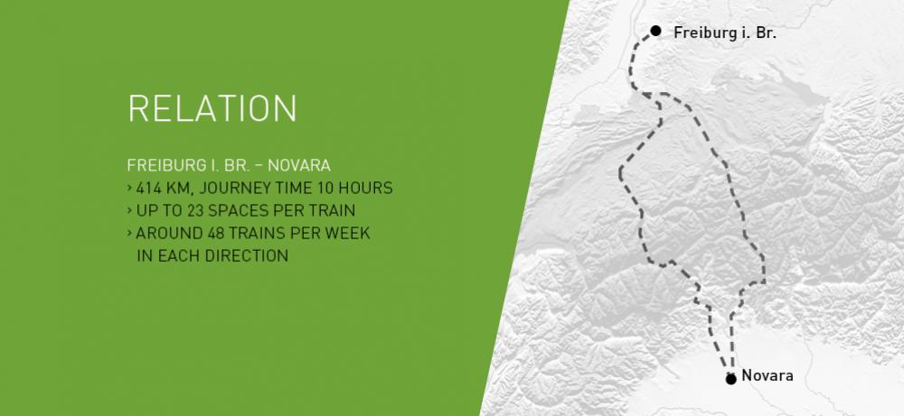 The Freiburg – Novara relation takes 10 hours to complete the 414 km trip. It offers space for up to 23 trucks and each week provides 48 services in each direction.